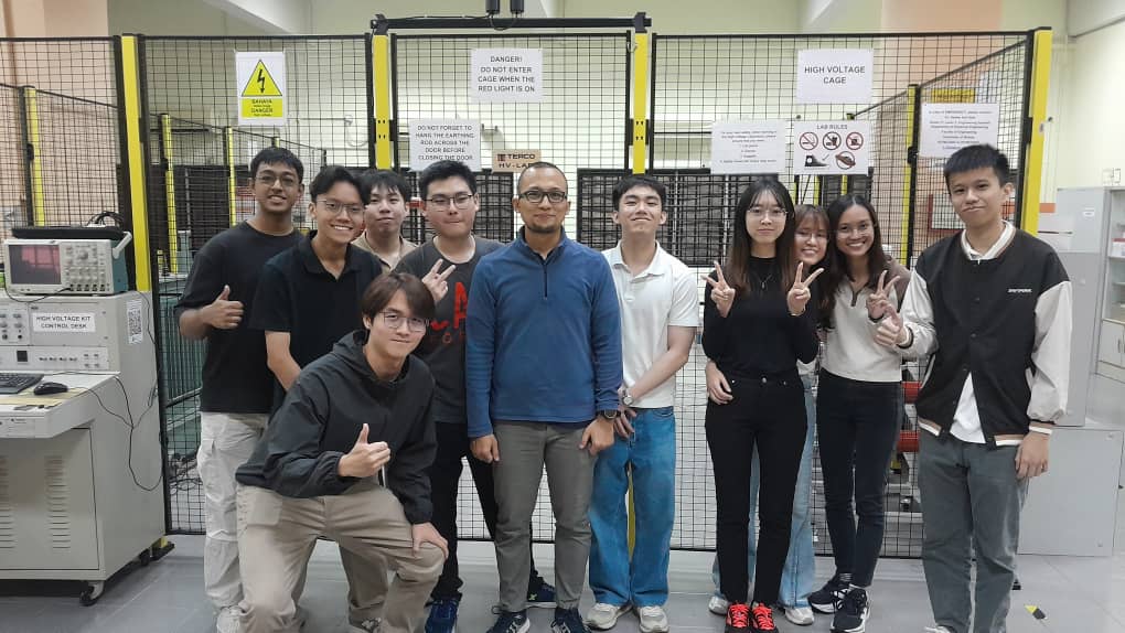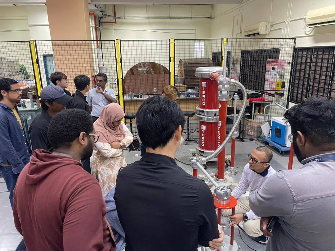 KUALA LUMPUR, 14 August 2025 – An academic staff and students from Monash University Malaysia visited the Universiti Malaya High Voltage Laboratory (UMHVL) at the Department of Electrical Engineering, Faculty of Engineering, Universiti Malaya on 13 and 14 August 2025. The visit was part of their educational activities. They were welcomed by the Head of UMHVL, Prof. Ir. Dr. Hazlee Azil Illias. During the visit, a member of UMHVL, Mr. Ciptian Weried Priananda, who is also a member of IEEE Universiti Malaya Student Branch, explained the lab safety requirement and demonstrated high impulse voltage generation to the visitors.